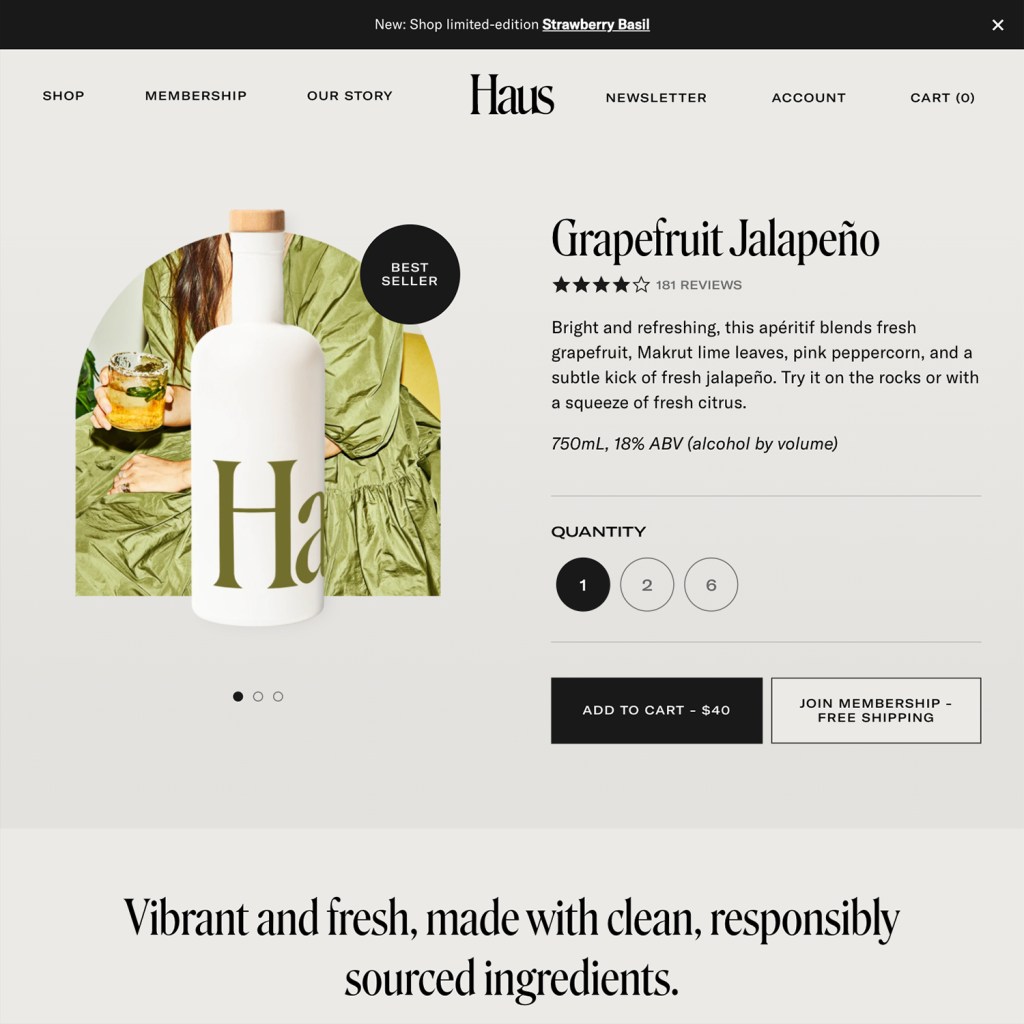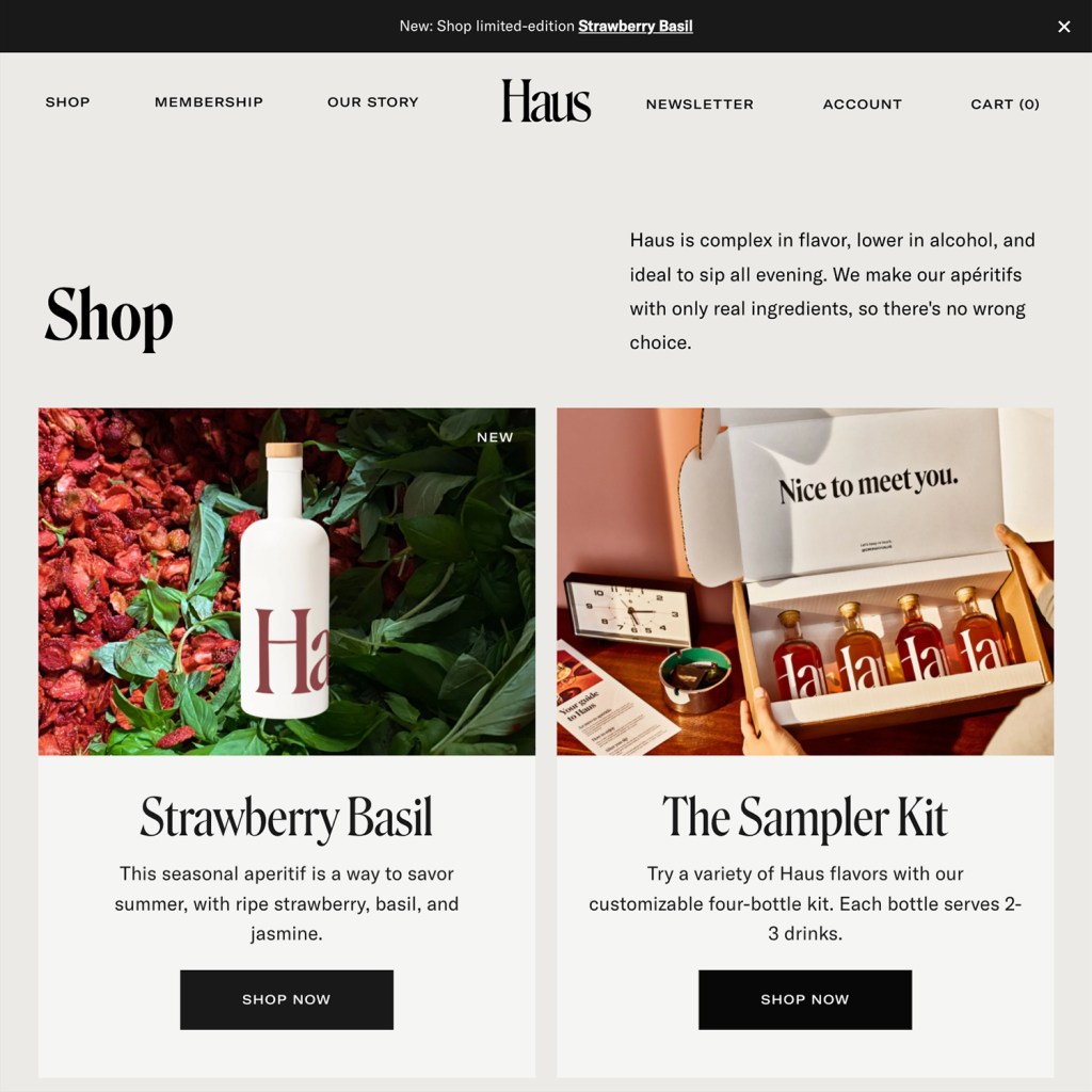 Haus is a Sonoma-based spirits company that makes low-ABV (alcohol by volume) apéritifs made from all-natural ingredients. Apéritifs are liquors flavored with roots, herbs, and botanicals. meant to be an alternative to hard liquors. The photos, colors and typography are well-coordinated and pleasing to the eye, creating a cohesive and polished look.